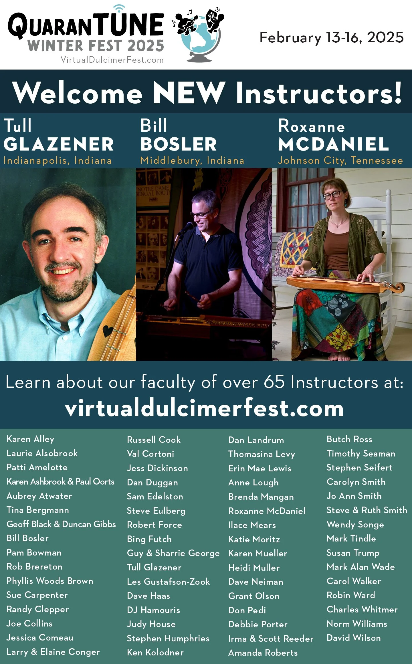 I’m excited to be teaching and performing at my 15th online QuaranTune Virtual Dulcimer Fest, February 13-16, 2025. To learn more and to register, please visit QuaranTune Winter Fest 2025. Titles, descriptions, preview videos, and handout samples are below.
